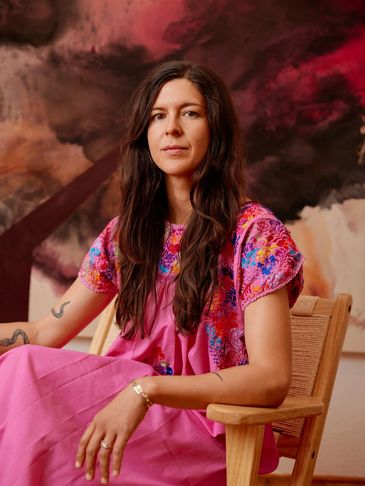 Inspired by the desert and sky, Julia draws symbols from nature: mountains as aspiration, water as passage, and storms as inner turmoil. Her process is experimental, using diluted paints, solvents, and organic materials such as beet juice, green tea, and earth pigments collected on her journeys.